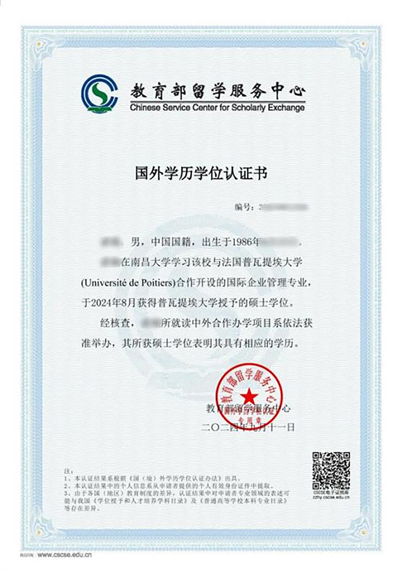 教育部留学服务中心国外学历学位认证书样本
