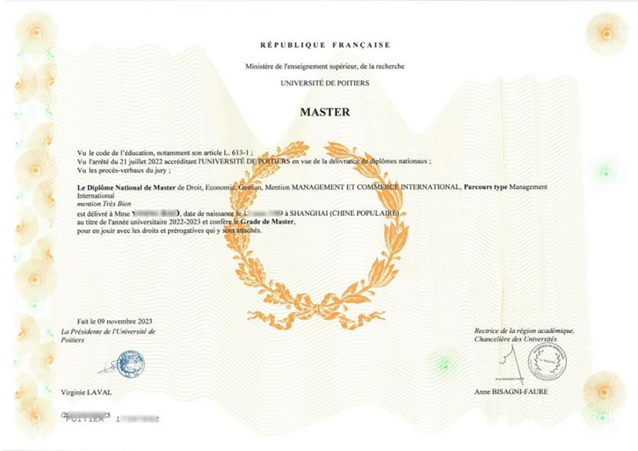 法国普瓦提埃大学国际企业管理硕士(碳中和方向)学位证书样本(法国国家文凭)